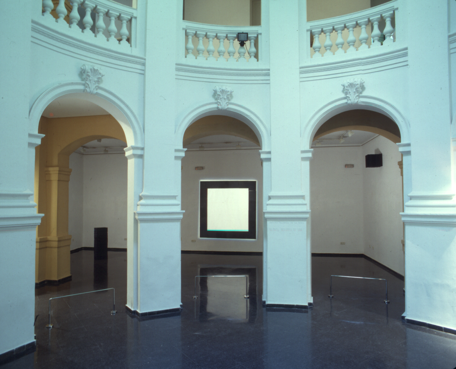 La sala muestra/oculta una columna de cuadros de 100 cm de altura, alzada con 52 piezas desde el apoyo del suelo; una gárgola materializada con 26 cuadros superpuestos, sobresaliendo 50 cm, en lo alto de un lateral de la pared; y una tercera pieza, definida por una serie organizada de cuadros que construye el contorno de un cuadrado de 200 cm de lado o ventana colgada a la pared.