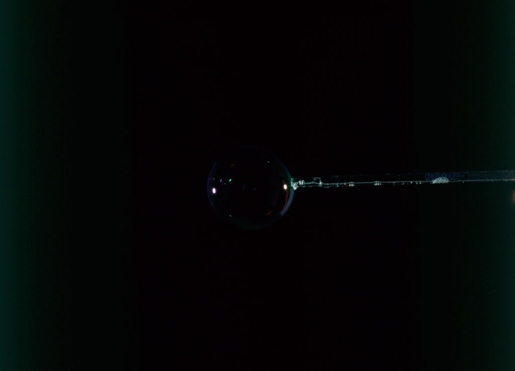 Díptico en el que se ha empleado la técnica de fotografía cibachrome montada sobre aluminio (50×100 cm c/u), para representar un “detalle elemental”. Un elemental detalle, un casi nada en el límite de lo visible que flota en el aire, efímero, antes de su fatal explosión; los colores y las formas del mundo en un remolino circular e irisado. Un juego de niños, soplar burbujas de jabón.