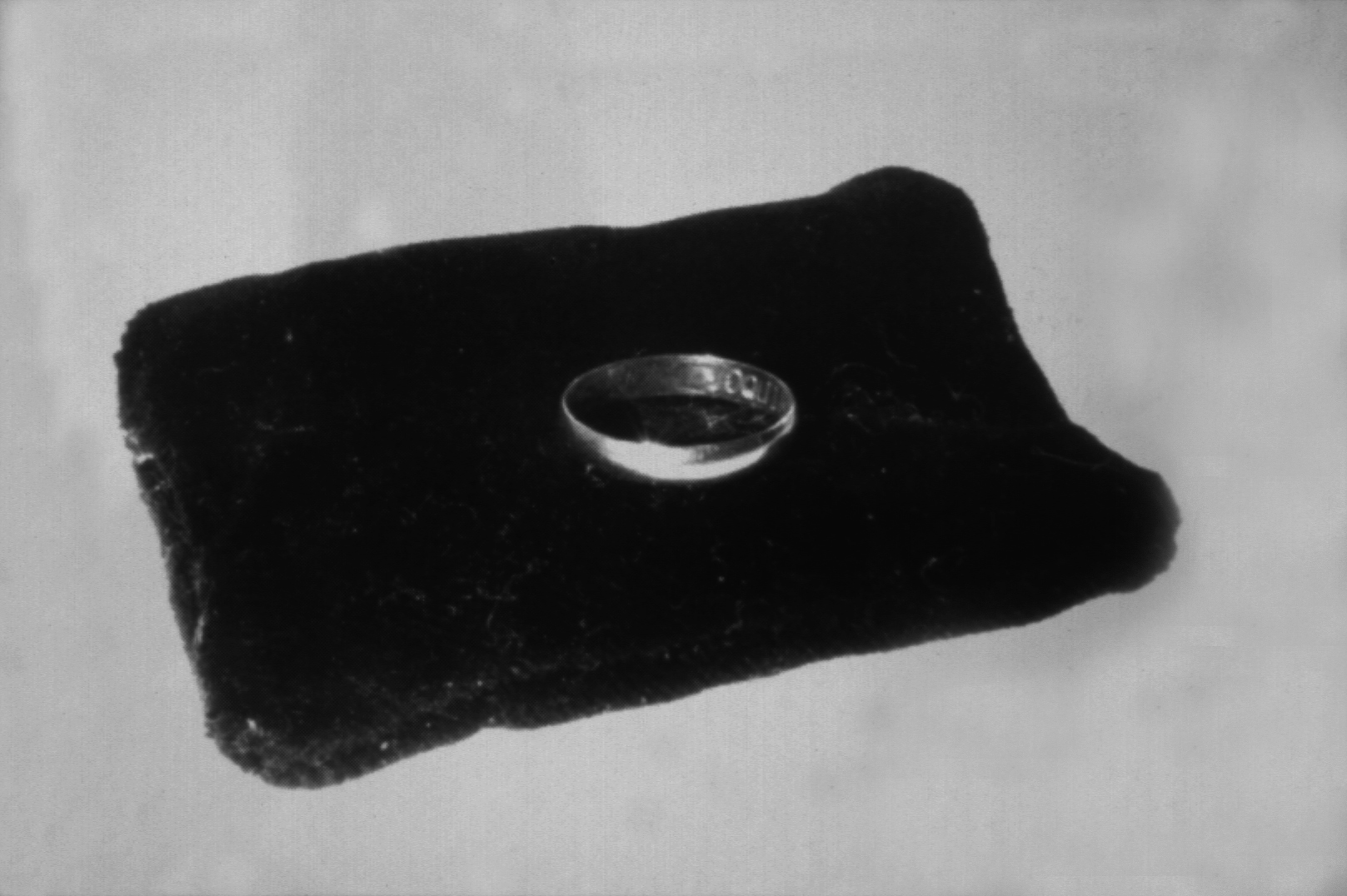 Las imágenes empleadas corresponden a nuestras propias tarjetas y documentos de identidad. A este grupo de tarjetas hemos incorporado la imagen fotográfica de una alianza apoyada sobre un pequeño cojinete de terciopelo negro, más un texto.